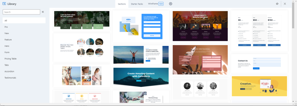 You can now start adding your layout sections. There are two ways to choose your layouts. You can use the Design Library, located at the top of the page, which provides you with many different layout designs.