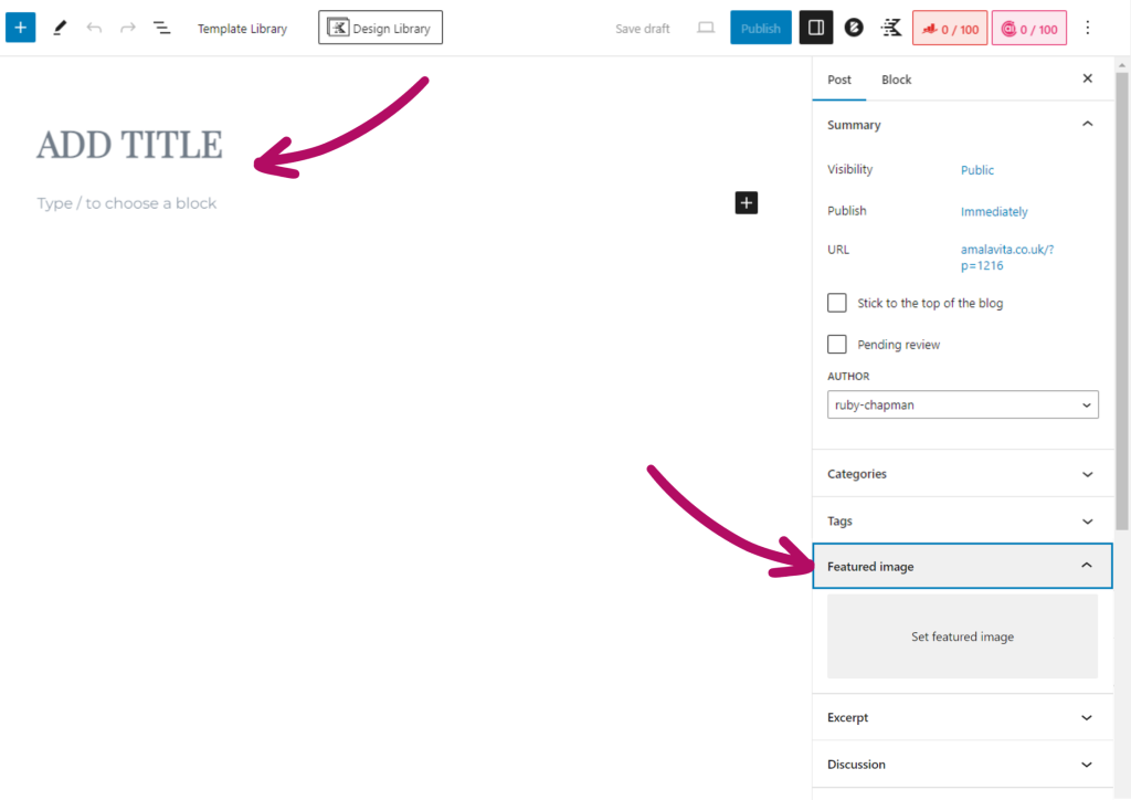To begin, give your blog post a title, and add a featured image too if you like. (this will be the cover photo for this post).