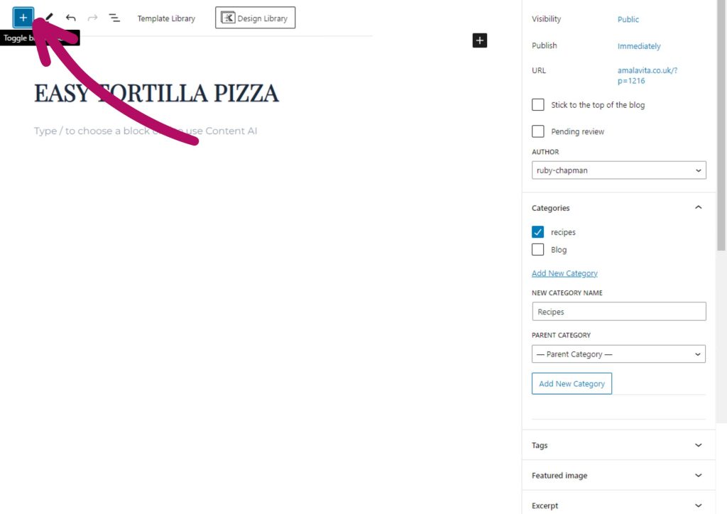 Now it’s time to add content to your blog post. To get started, click the “+” button located at the top left corner of the page. This will open up a list of available content blocks.