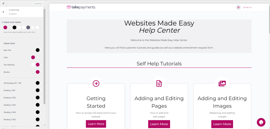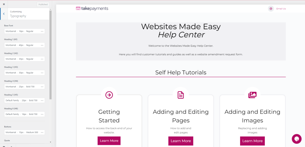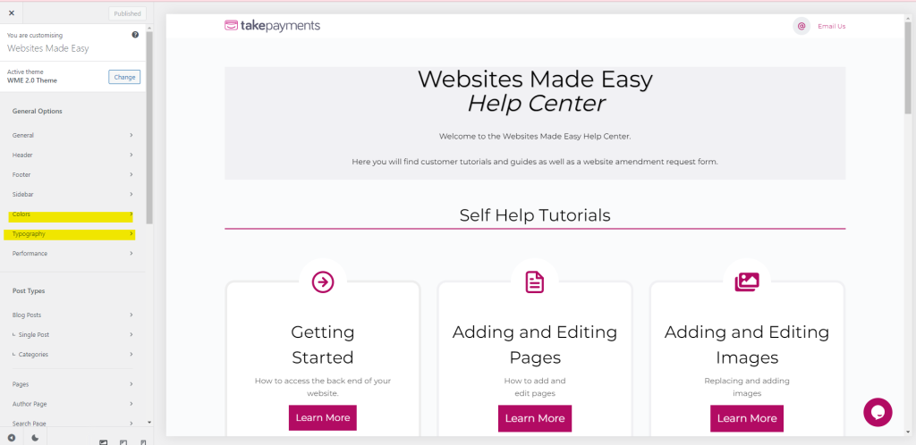 You will be presented with a panel on the left hand side which has all the settings throughout the website. We will be focusing on the Colours and Typography tabs.