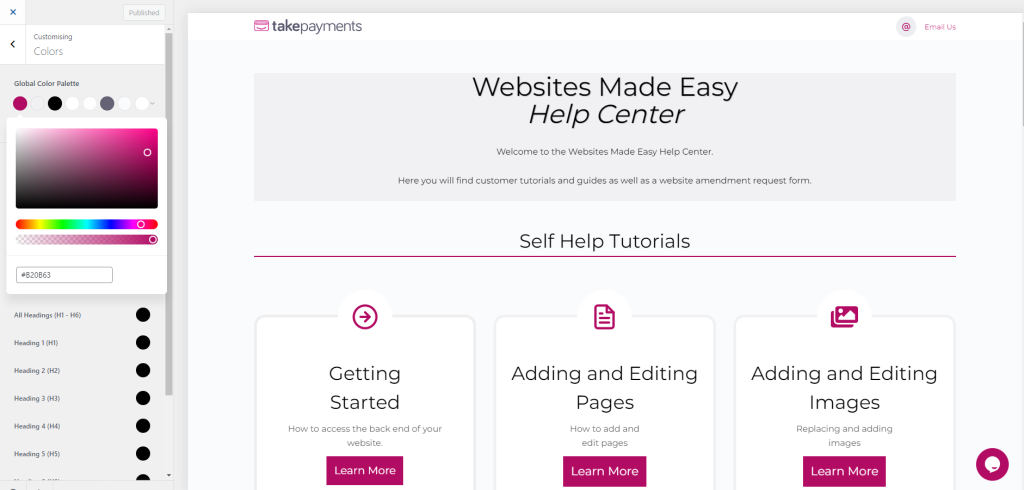 Select the colours tab. You will see “Global Colour Palette” which has the main colour palette that has been used throughout your website.