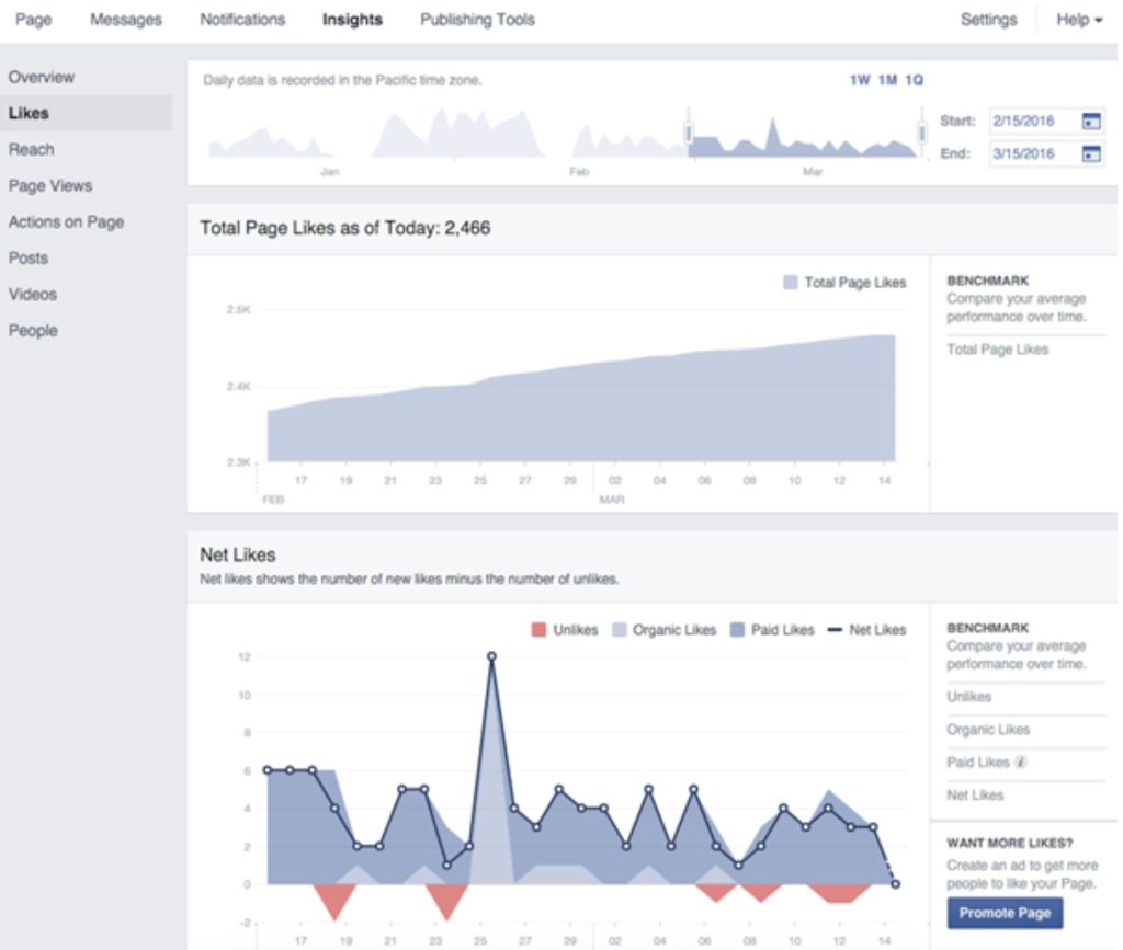‘Net likes’ shows new likes minus unlikes. While new likes are great, watch for increasing unlikes—they may need attention.