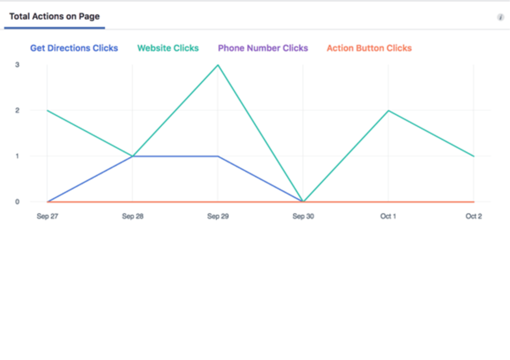 The Actions on Page section shows what users do when they visit your page. Different actions may be more relevant depending on the type of business: a local business may focus on directions, while an online business may prioritize website clicks.