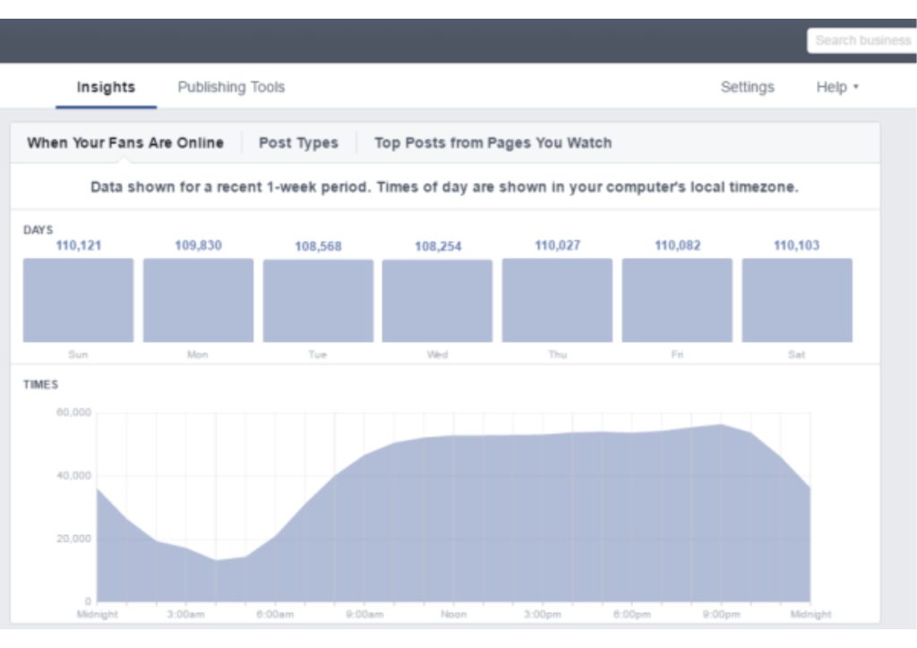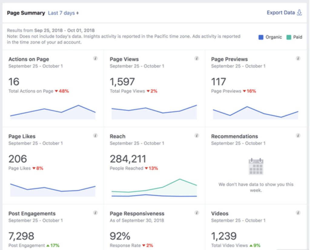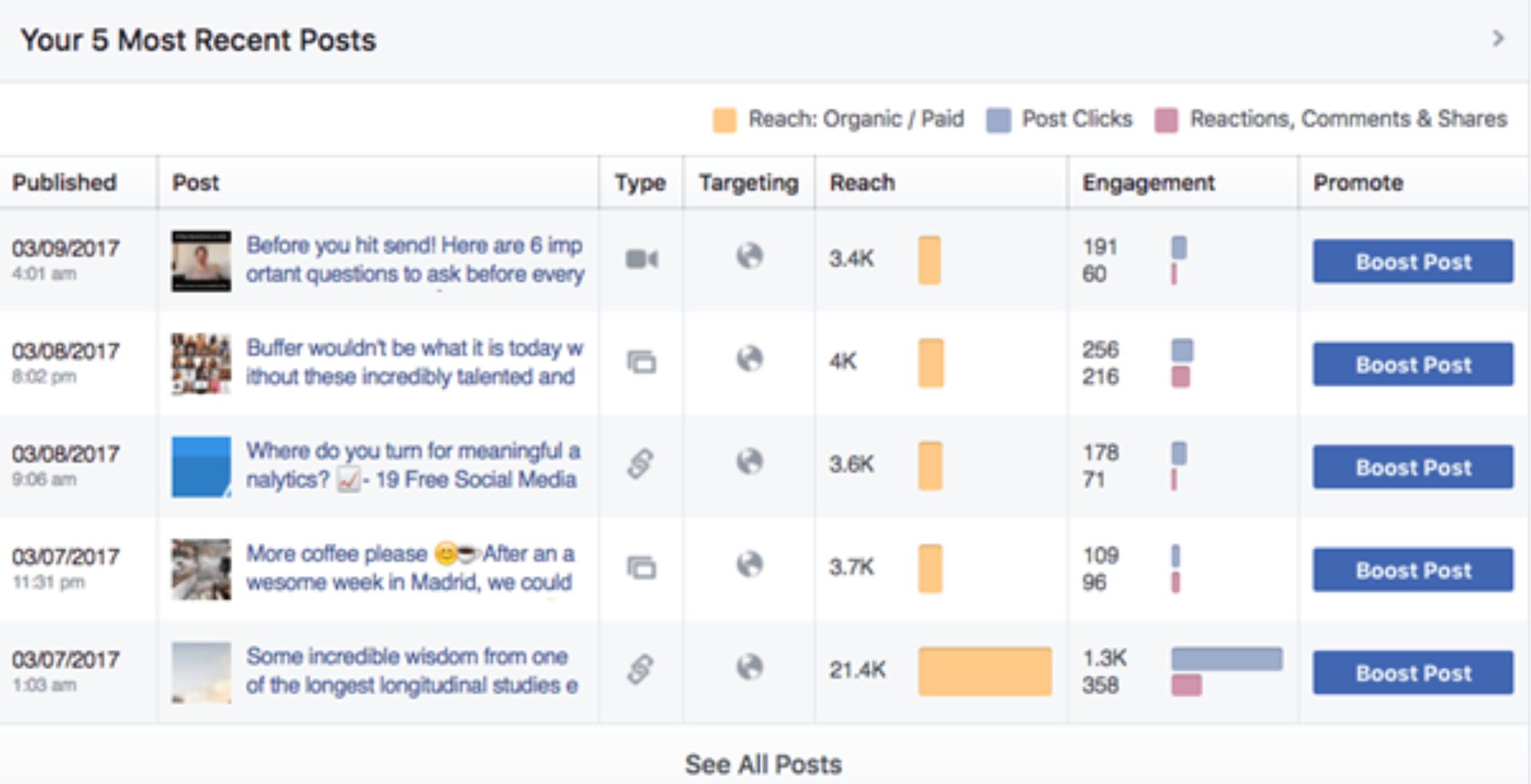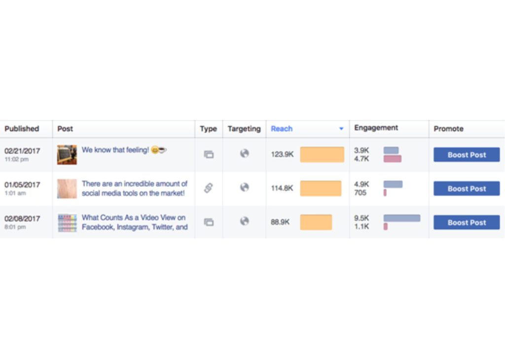 Here, you’ll see your page’s key metrics from the past week—Page Likes, Post Engagement, and Reach—along with percentage changes from the previous week to track trends. While reach and likes are helpful, focus on engagement, as engaged users are more likely to become customers.