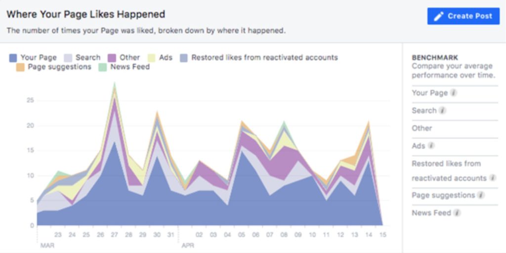 This graph shows where your page likes come from—useful for assessing your Facebook strategy. You’ll see if likes came from your page, Facebook suggestions, or ads. If ads aren’t driving likes, consider whether they’re worth the cost and adjust your strategy to improve ROI.