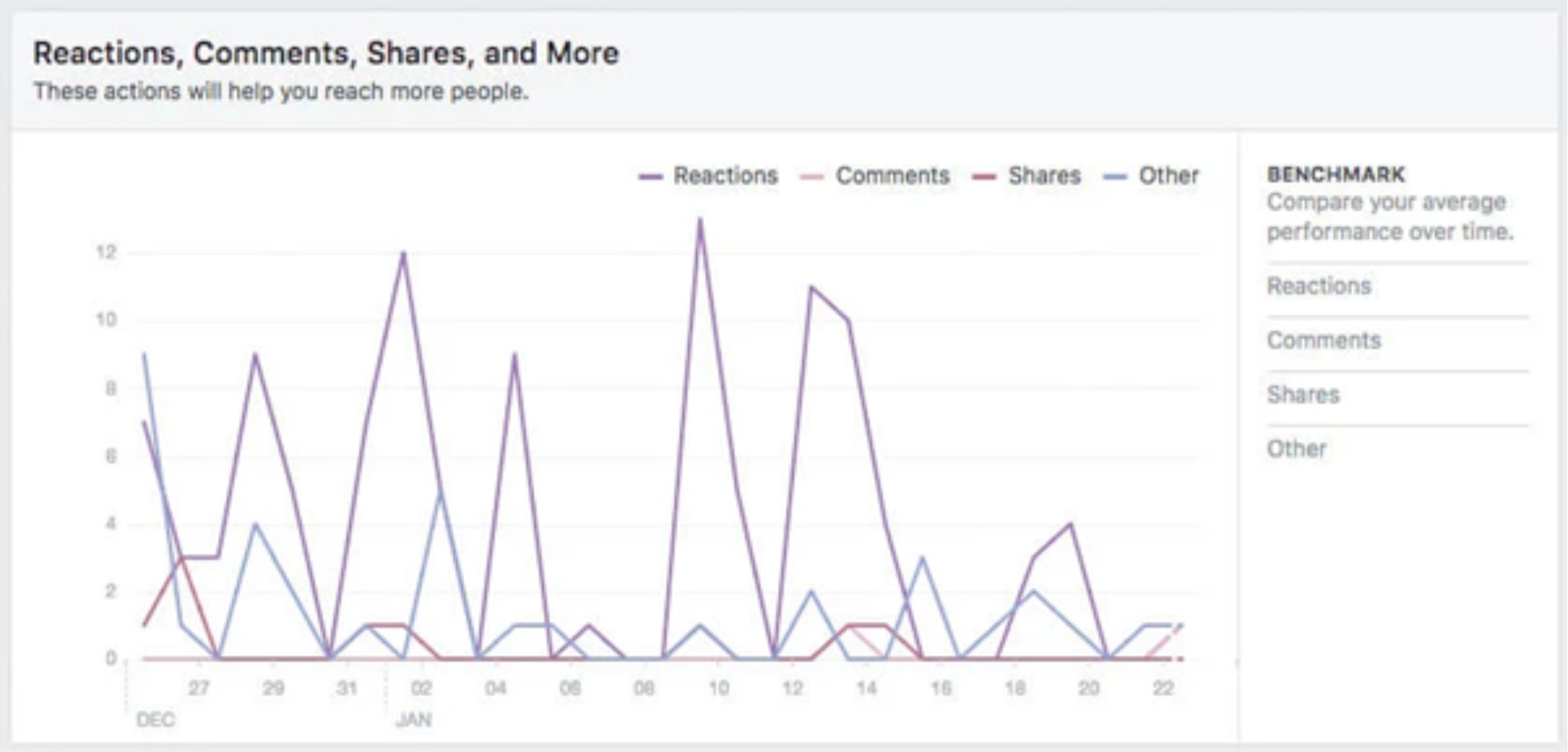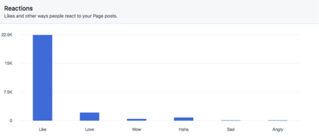 This metric shows which reactions (like, love, wow, etc.) users choose. Desired reactions depend on the post’s nature, and Facebook only provides this breakdown if a post gets enough reactions.