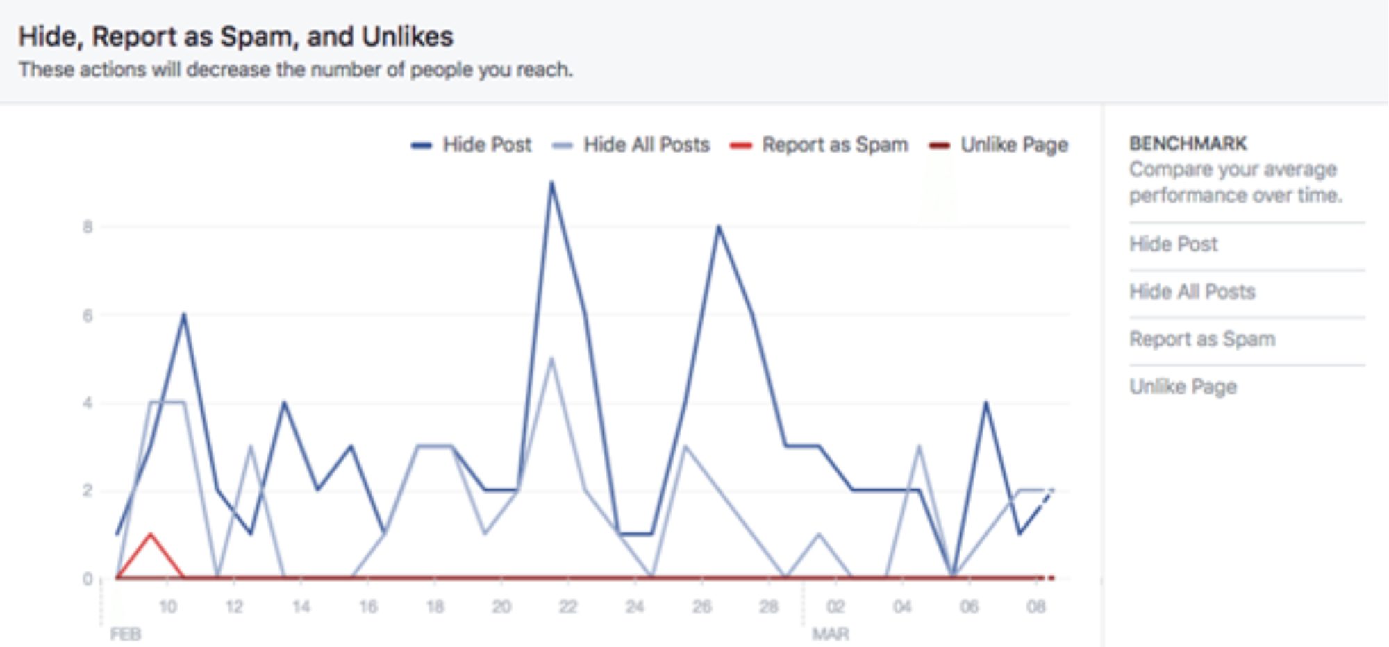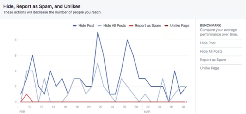 Users can give negative feedback by choosing options like “Hide post” or “Report as spam.” Such feedback reduces a post’s reach in Facebook’s algorithm, so keeping this low is essential.