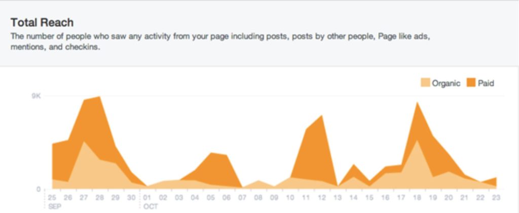 This graph shows your posts’ total reach, split into organic and paid sources. While reach isn’t a perfect success metric, it helps ensure you’re on track and shows if paid efforts are effective.