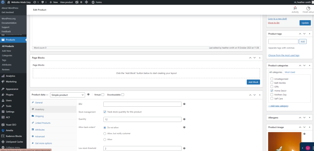 Make sure that the “Stock Management” Box is ticked. Stock quantity – enter for this product.