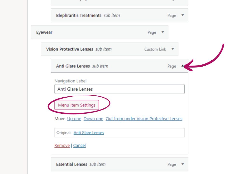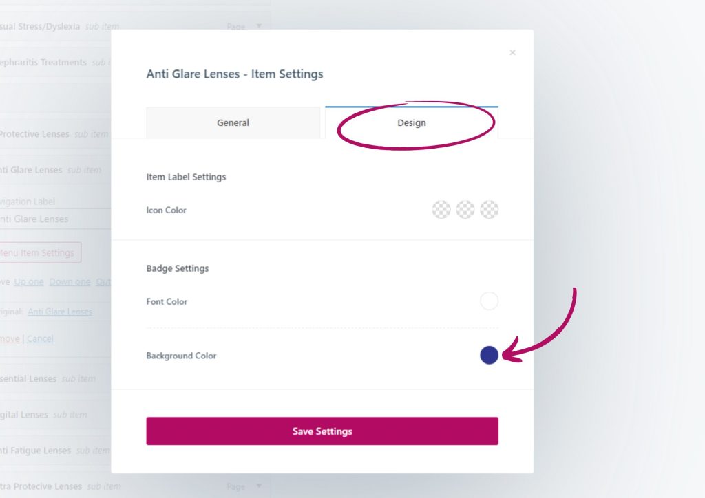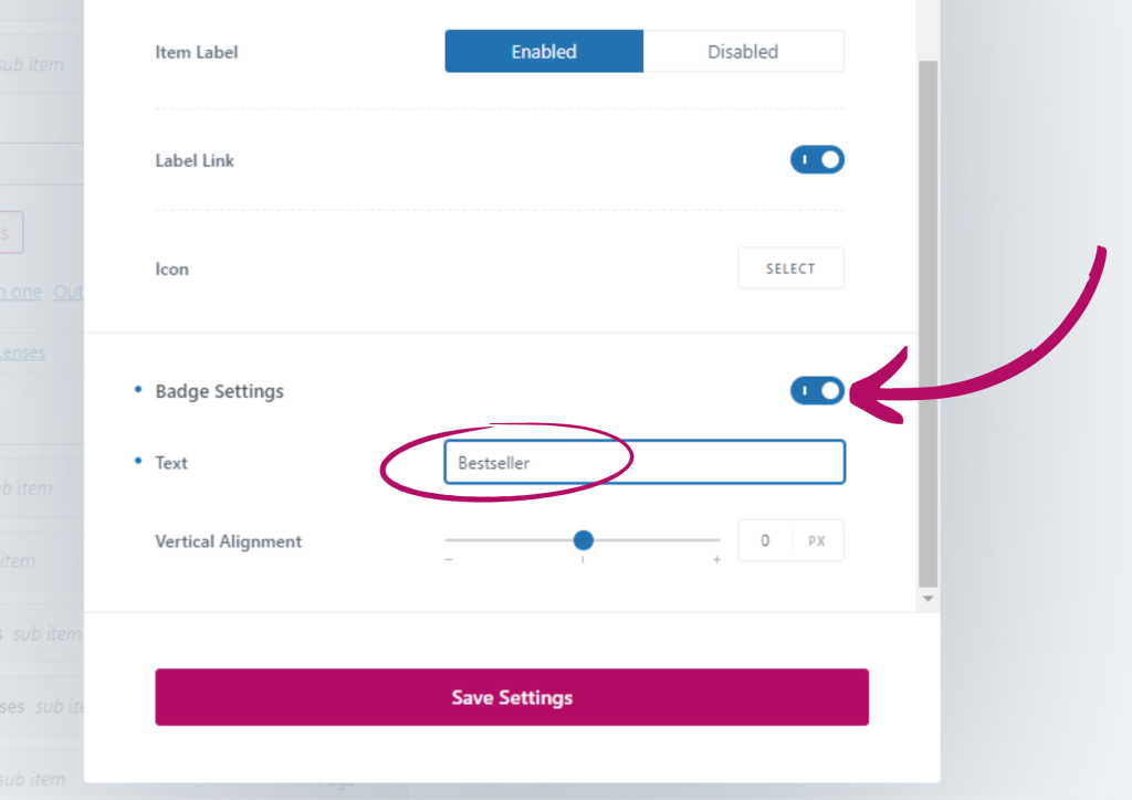 Navigate to the menu item to which you want to add a badge. Click the small arrow on the right side of the item to expand its options. Then, click the “Menu Item Settings” button.
